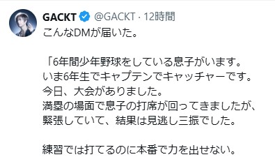 ミュージシャン・GACKTさんが、自身のX(旧Twitter)で、少年野球のキャプテンを持つ母親からの悩みに応える形で、感動的なメッセージを投稿!今、SNSが「GACKTさんの言葉に震えた」「子どもに伝えたい」と、共感と感動の声で大バズりしているのを知ってた... -